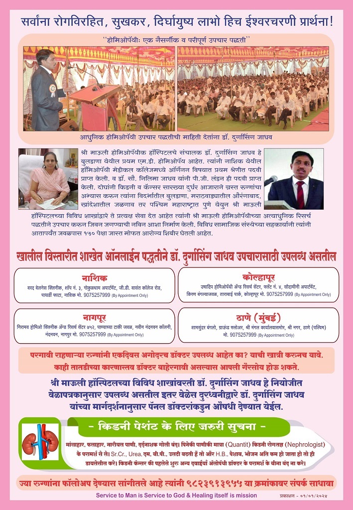 मला किडनीचा त्रास असून, उठता-बसता येत नव्हते, चालता येत नव्हते, चार लोकांनी धरुन उचलून गाडीमध्ये आणले, कारण मला उभे राहणे, चालने शक्य नव्हते, एक किडनी निकामी झाली असे सांगण्यात आले होते, श्री माऊलीज होमिओपॅथीच्या औषधीसुरु केल्यापासून मी आता स्वतः चालू शकतो, आधाराची गरज नाही. धन्यवाद श्री माऊलीज हॉमिओपॅथी